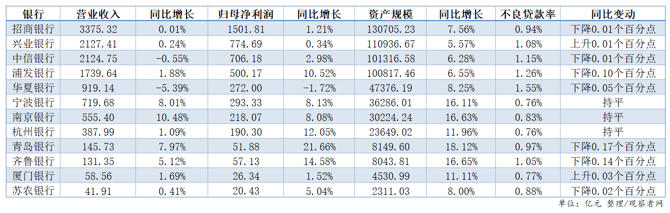 11家银行净利润增长,7家不良率低于1%
