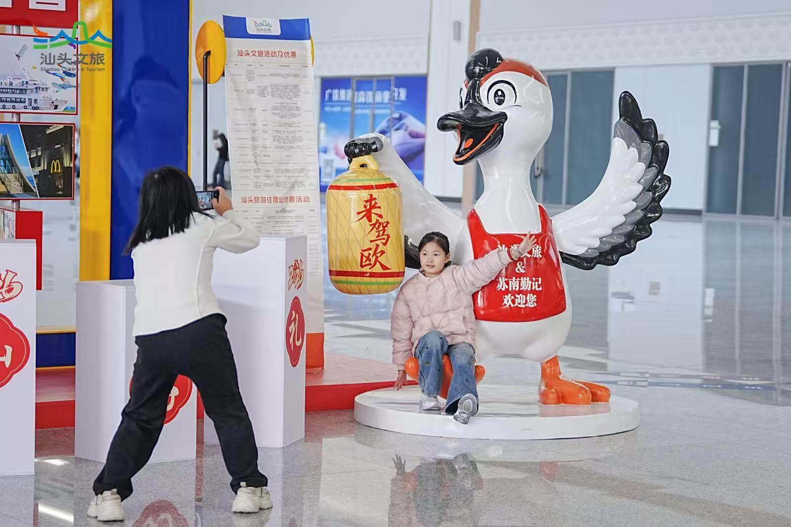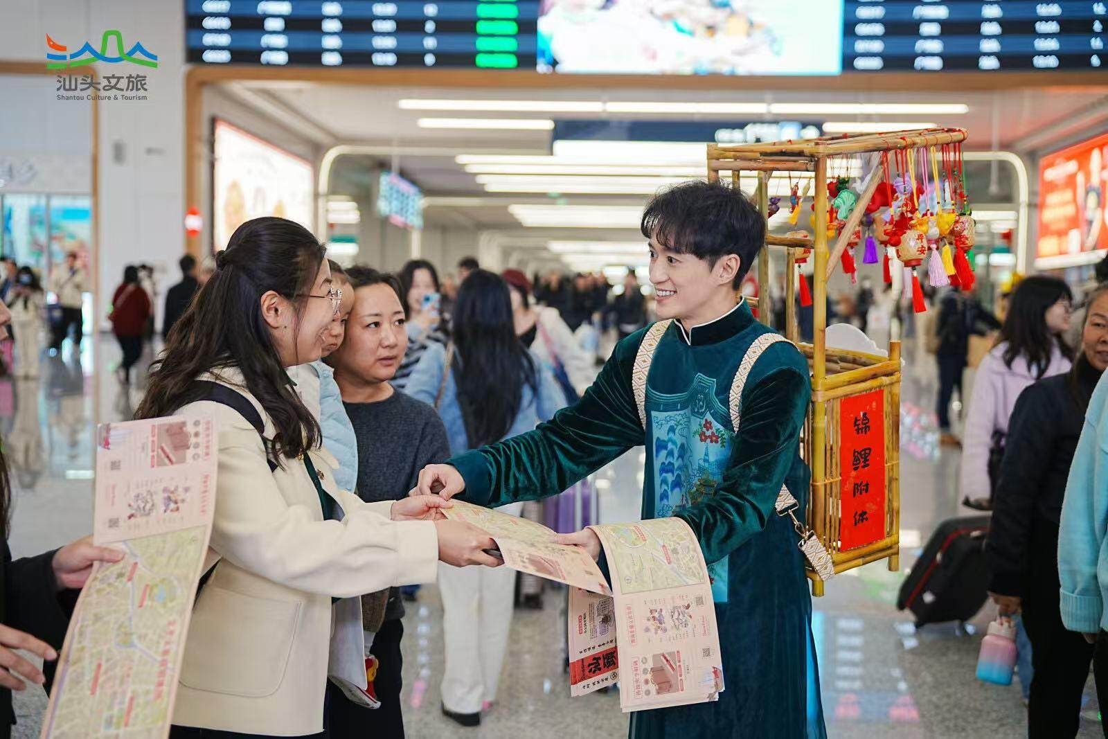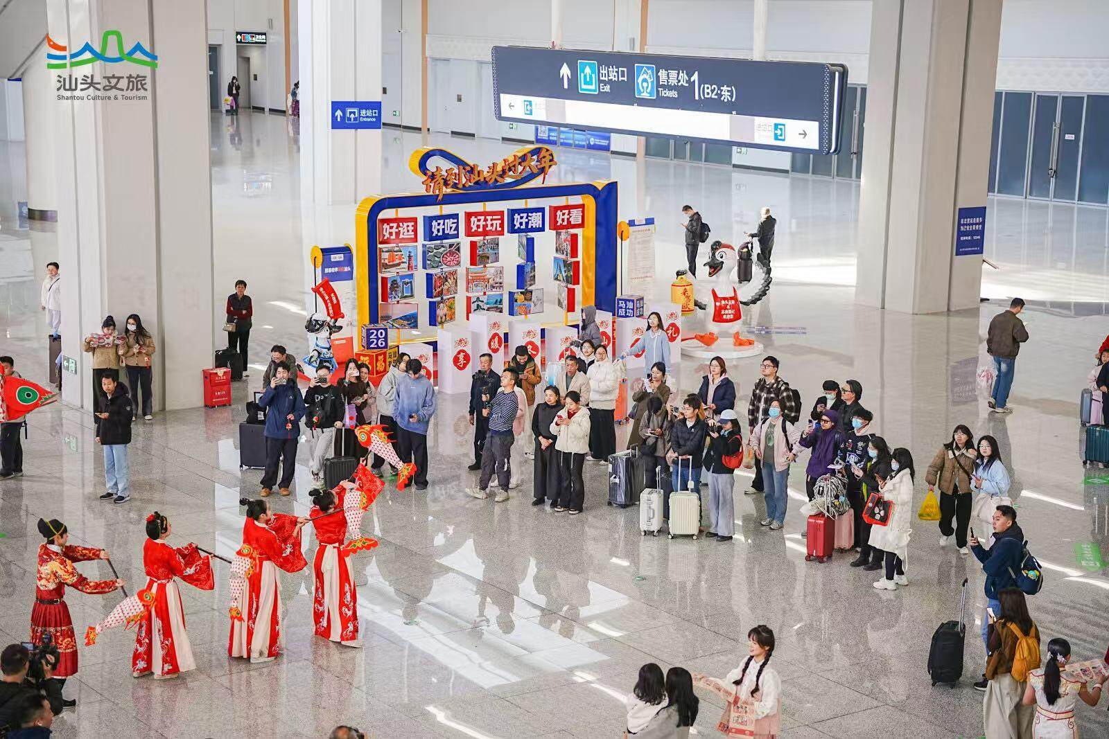 潮剧、鱼灯舞、英歌舞、舞蹈《中国少年》和阵容庞大的古筝串烧……精彩的文艺快闪轮番上演;出站口还有打扮精致的NPC,背着创意箩筐,随机发送文创糖果、美食地图、文创礼品等富隆咨询,给每位游客送上汕头的第一份好礼;“请到汕头过大年”和“粤享暖冬 至汕好礼”主题展架、萌萌的双咬鹅、喜庆的婚旅打卡点等,随便一拍都是氛围感大片。