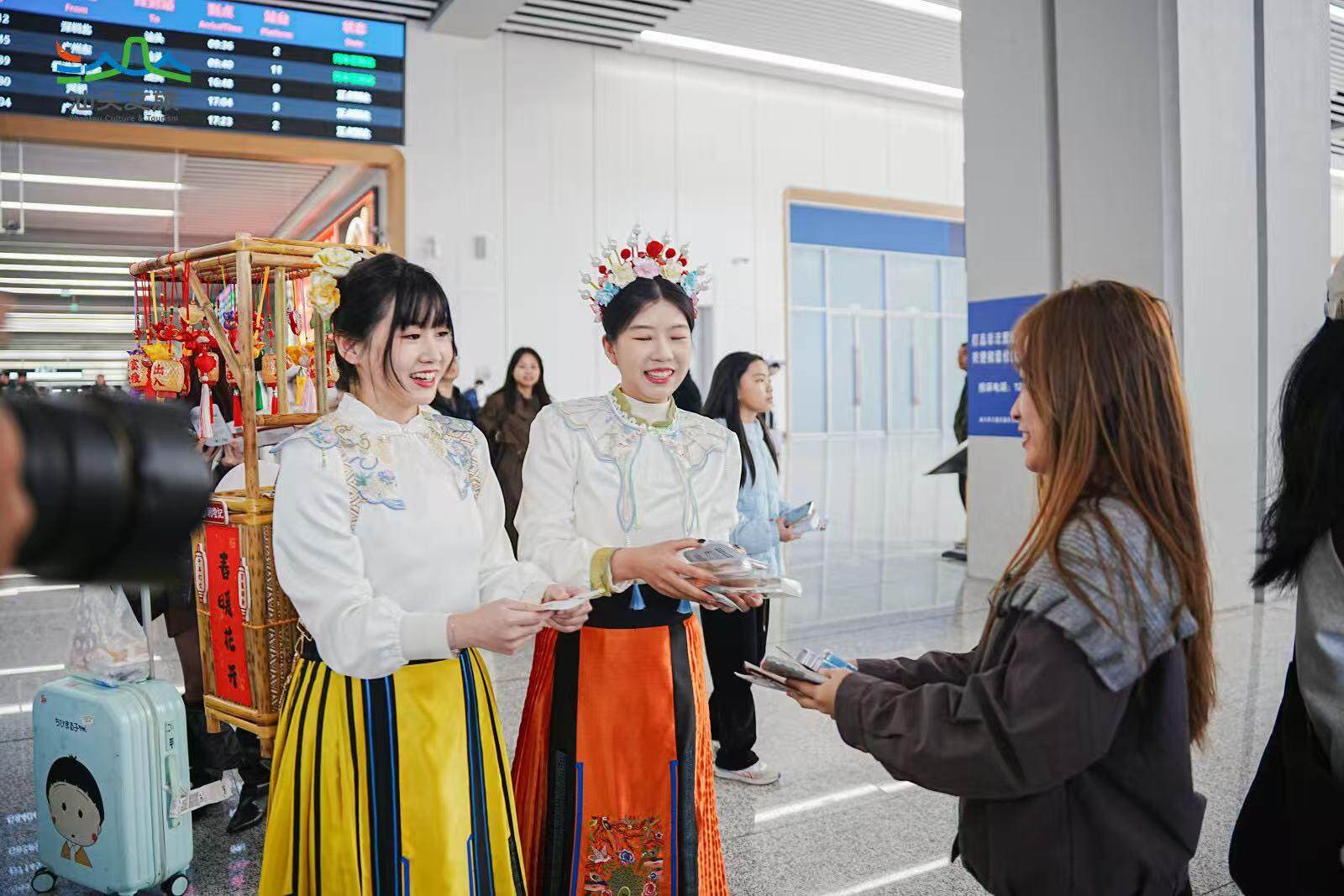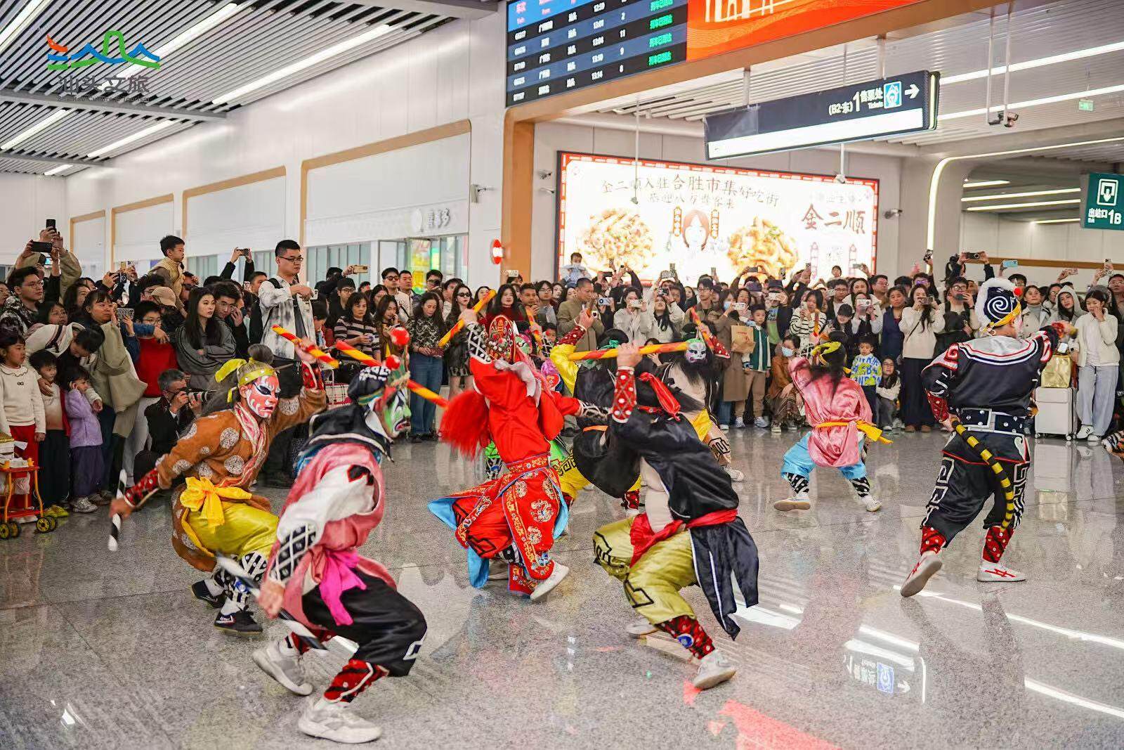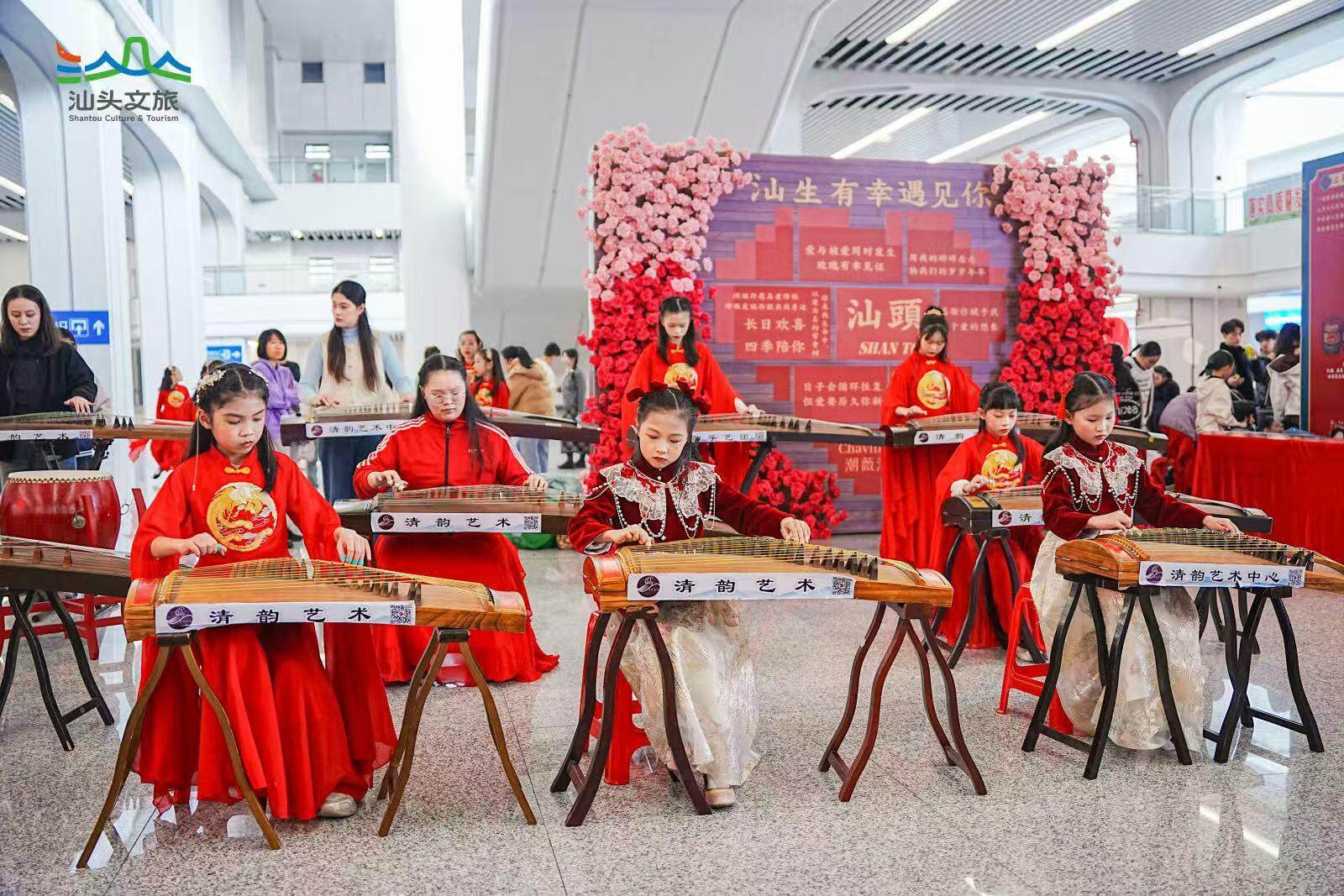 潮剧、鱼灯舞、英歌舞、舞蹈《中国少年》和阵容庞大的古筝串烧……精彩的文艺快闪轮番上演;出站口还有打扮精致的NPC,背着创意箩筐,随机发送文创糖果、美食地图、文创礼品等富隆咨询,给每位游客送上汕头的第一份好礼;“请到汕头过大年”和“粤享暖冬 至汕好礼”主题展架、萌萌的双咬鹅、喜庆的婚旅打卡点等,随便一拍都是氛围感大片。
