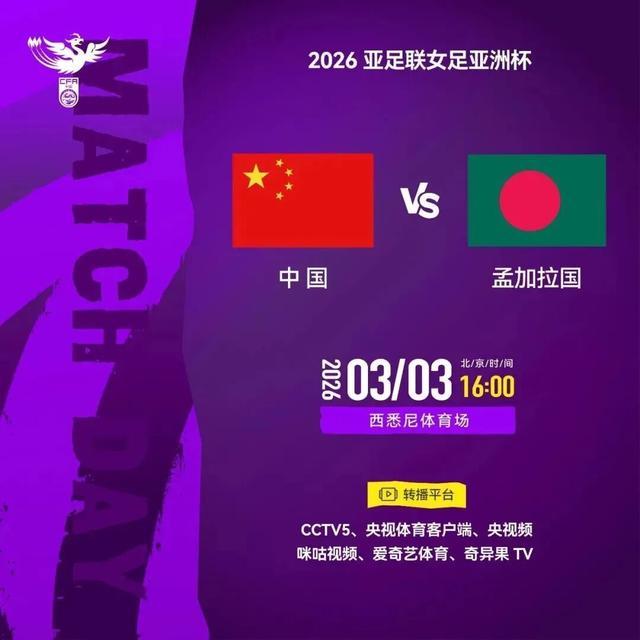 2026女足亚洲杯中国队将于北京时间3月3日亮相,小组赛首轮对阵孟加拉国队。