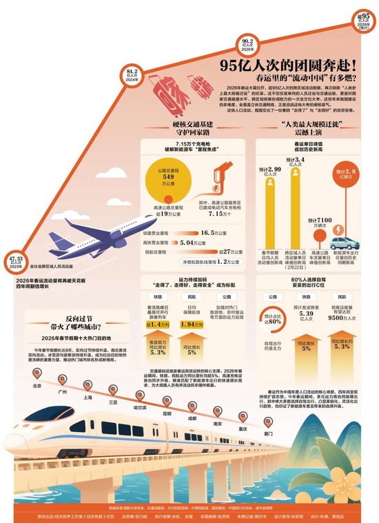 今年春节迎来9天史上最长假期,旅客探亲、旅游的出行需求较往年更为旺盛。据悉,今年春运全社会跨区域人员流动量预计将达95亿人次,创历史新高。